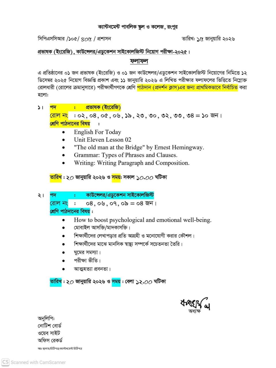 | January 15, 2026 | প্রভাষক ( ইংরেজি ) ও সাইকোলজিস্ট পদে প্রদর্শন ক্লাসের জন্য নির্বাচিতদের তালিকা ও সময়সূচি ২০২৬ |
