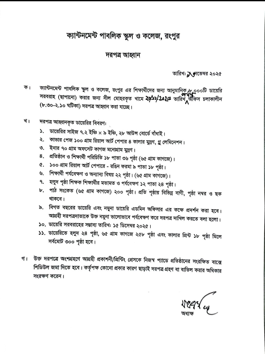 চাহিদা মোতাবেক ডায়রী সরবরাহের দরপত্র ২০২৫by dhakaNovember 17, 2025 Download/View previousআইডি কার্ড এবং প্রয়োজনীয় দ্রব্যাদির দরপত্র ২০২৫nextসহকারী শিক্ষক পদে নিয়োগের লিখিত পরীক্ষার ২০২৫ এর সময়সূচি পরিবর্তন ( তারিখ অপরিবর্তিত ) সংক্রান্ত