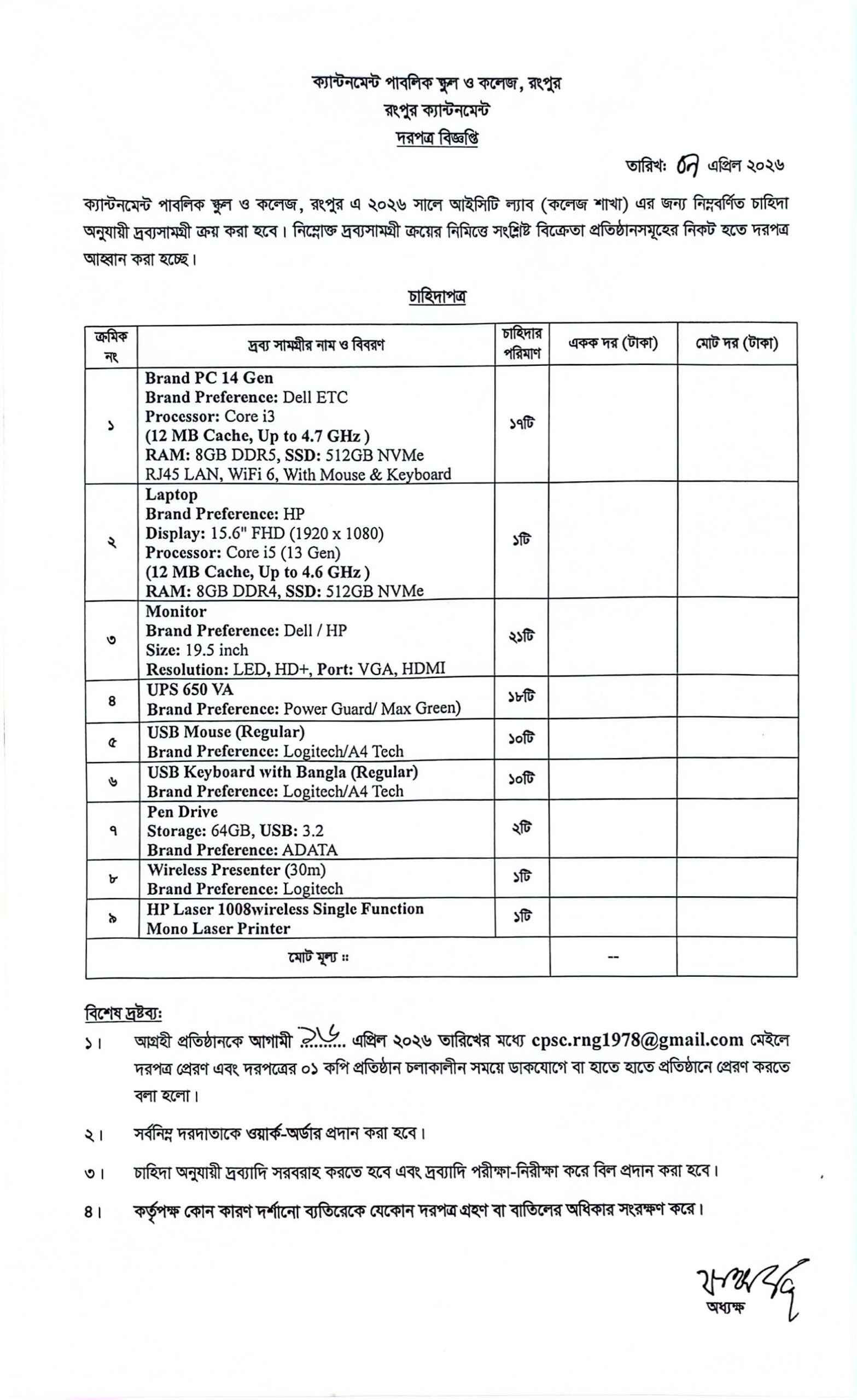 কম্পিউটার ও অনান্য হার্ডওয়্যার ক্রয়ের দরপত্র ২০২৬by dhakaApril 9, 2026 Download/View previousপেশ ইমাম পদে নিয়োগের লিখিত পরীক্ষার ফলাফল ২০২৬